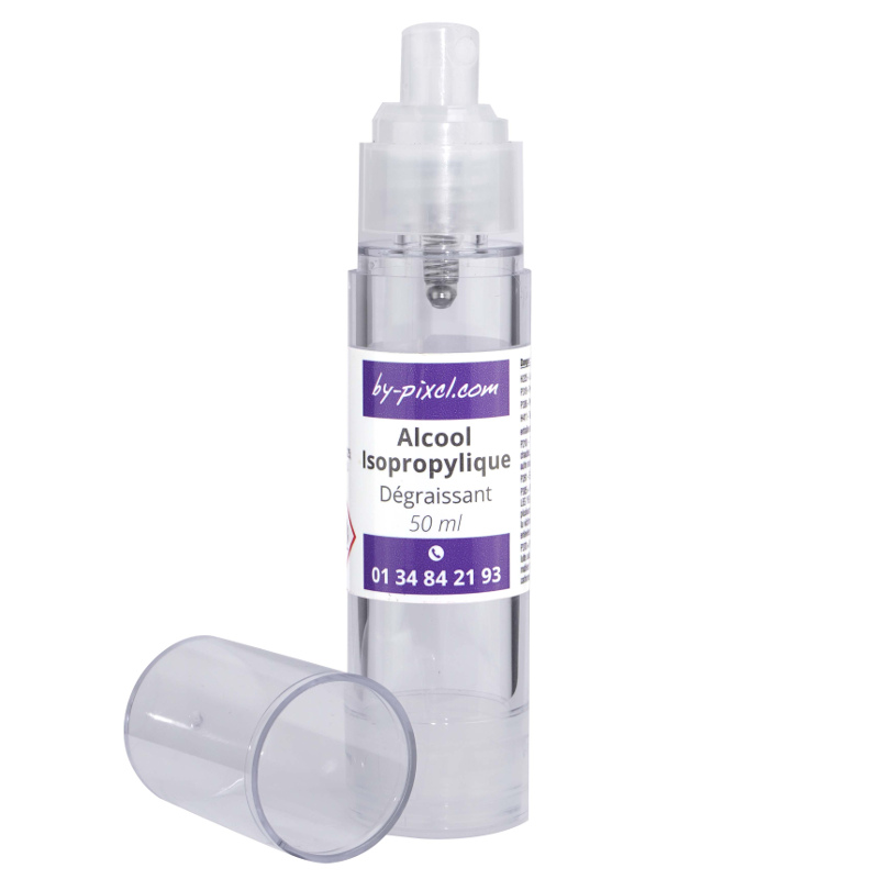 Pulvérisateur de 50ml d’alcool isopropylique de marque Pixcl, idéal pour dégraisser les surfaces avant l’assemblage pas collage ou adhésivage.
