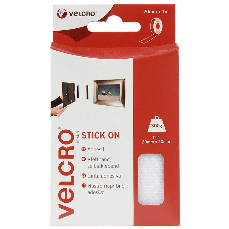 Scratch auto-agrippant adhésif de marque VELCRO® Blanc, en petit conditionnement. Permet de fixer ou accrocher tous types d’objets aussi bien au bureau qu’à la maison. Largeur : 20mm. Longueur : 1m