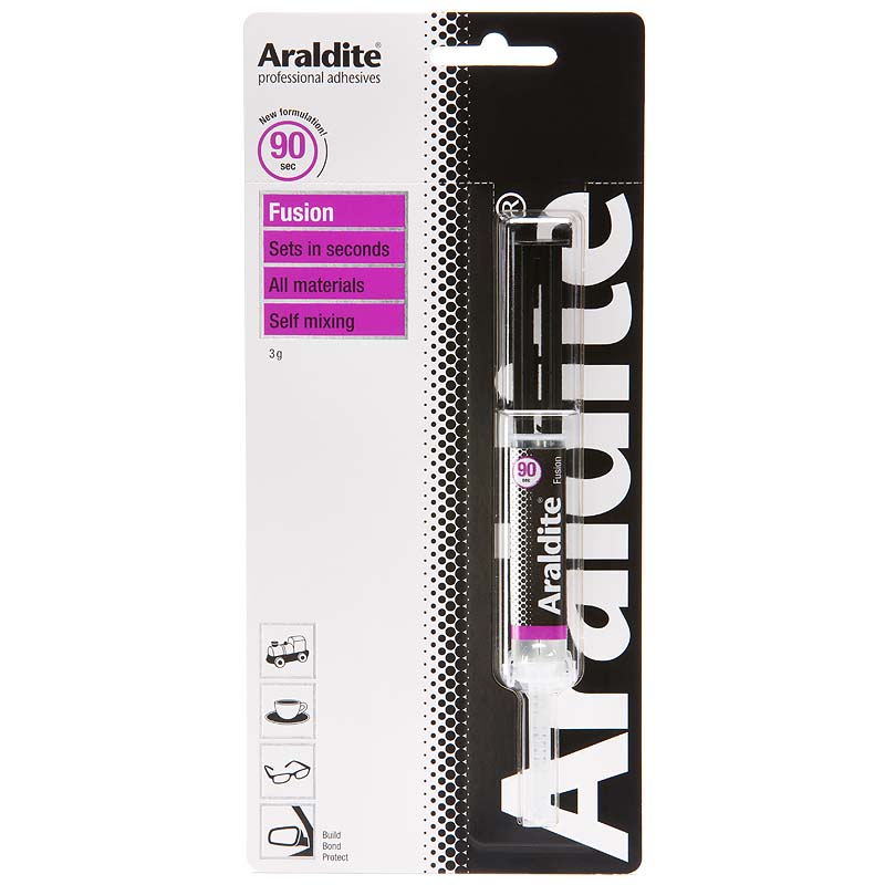 Araldite® Fusion est une colle époxy bi-composant à prise très rapide. Les éléments collés sont repositionnables pendant 60 secondes et l’assemblage est manipulable après 4 minutes. La pleine solidité est atteinte après 2 heures. Haute résistance à l’arrachement, à l’humidité, aux huiles, produits chimiques, chocs et vibrations. Tenue en température : -30°C à +65°C.