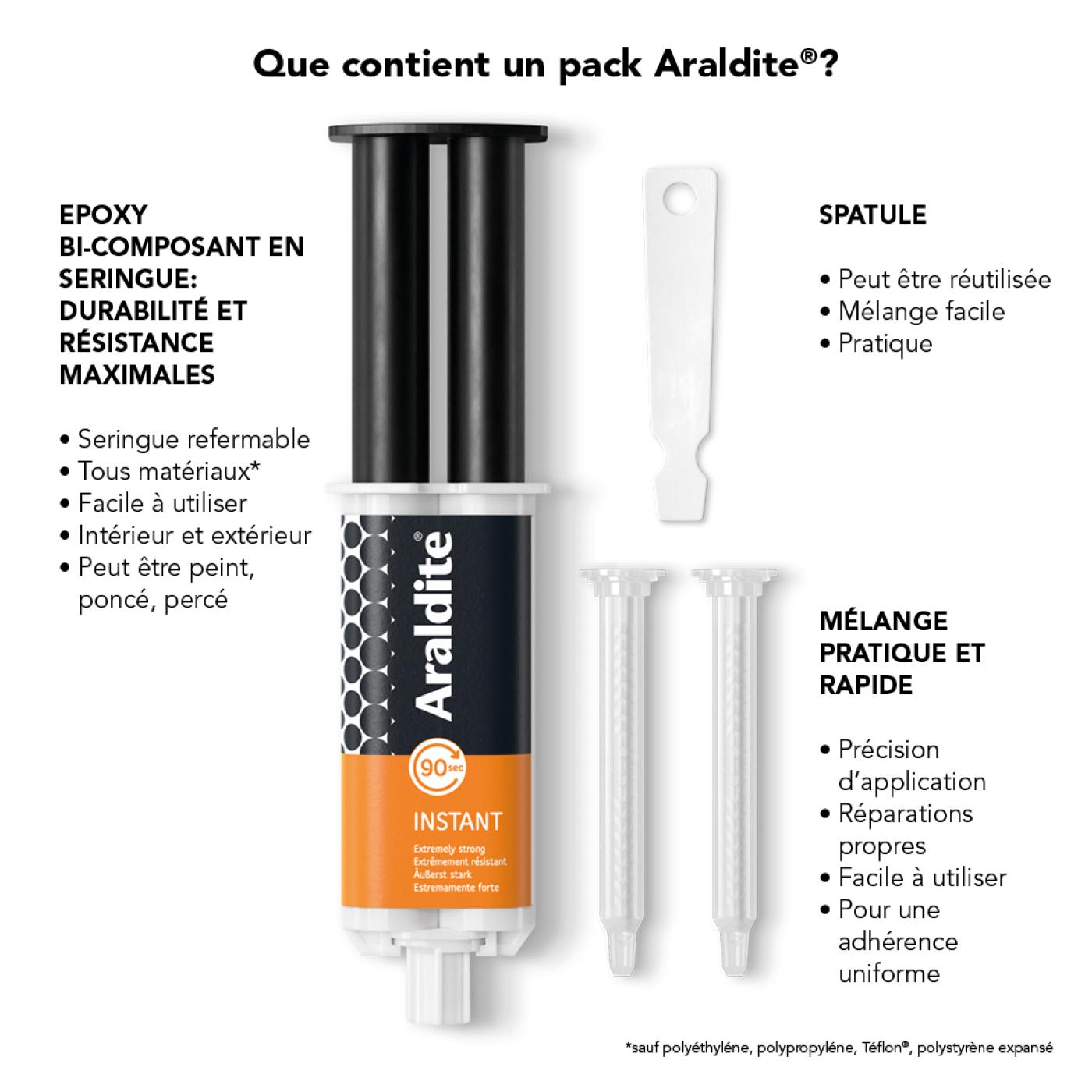 Araldite® Instant est une colle époxy bi-composant à prise très rapide et idéale pour vos réparations du quotidien. Les éléments collés sont repositionnables pendant 60 secondes et l’assemblage est manipulable après 4 minutes. La pleine solidité est atteinte après 2 heures. Haute résistance à l’arrachement, à l’humidité, aux huiles, produits chimiques, chocs et vibrations. Tenue en température : -30°C à +70°C.