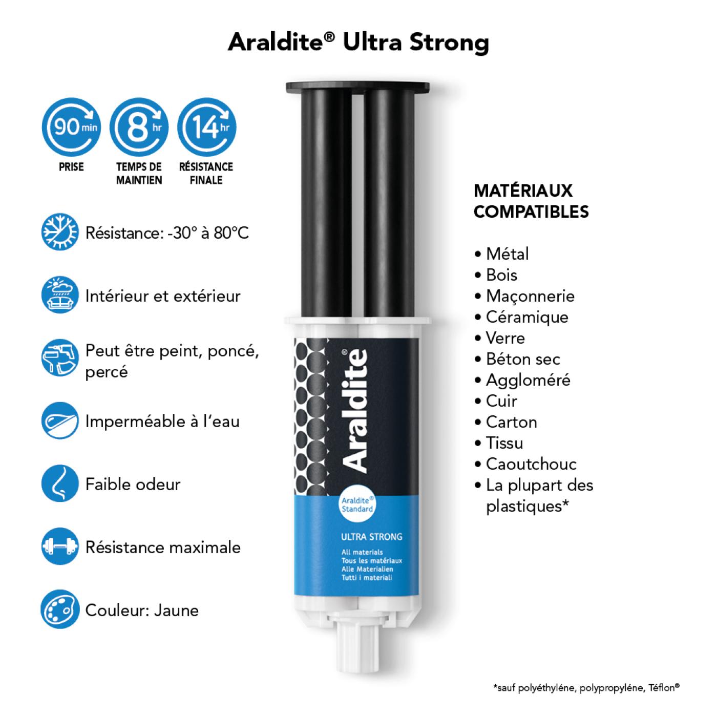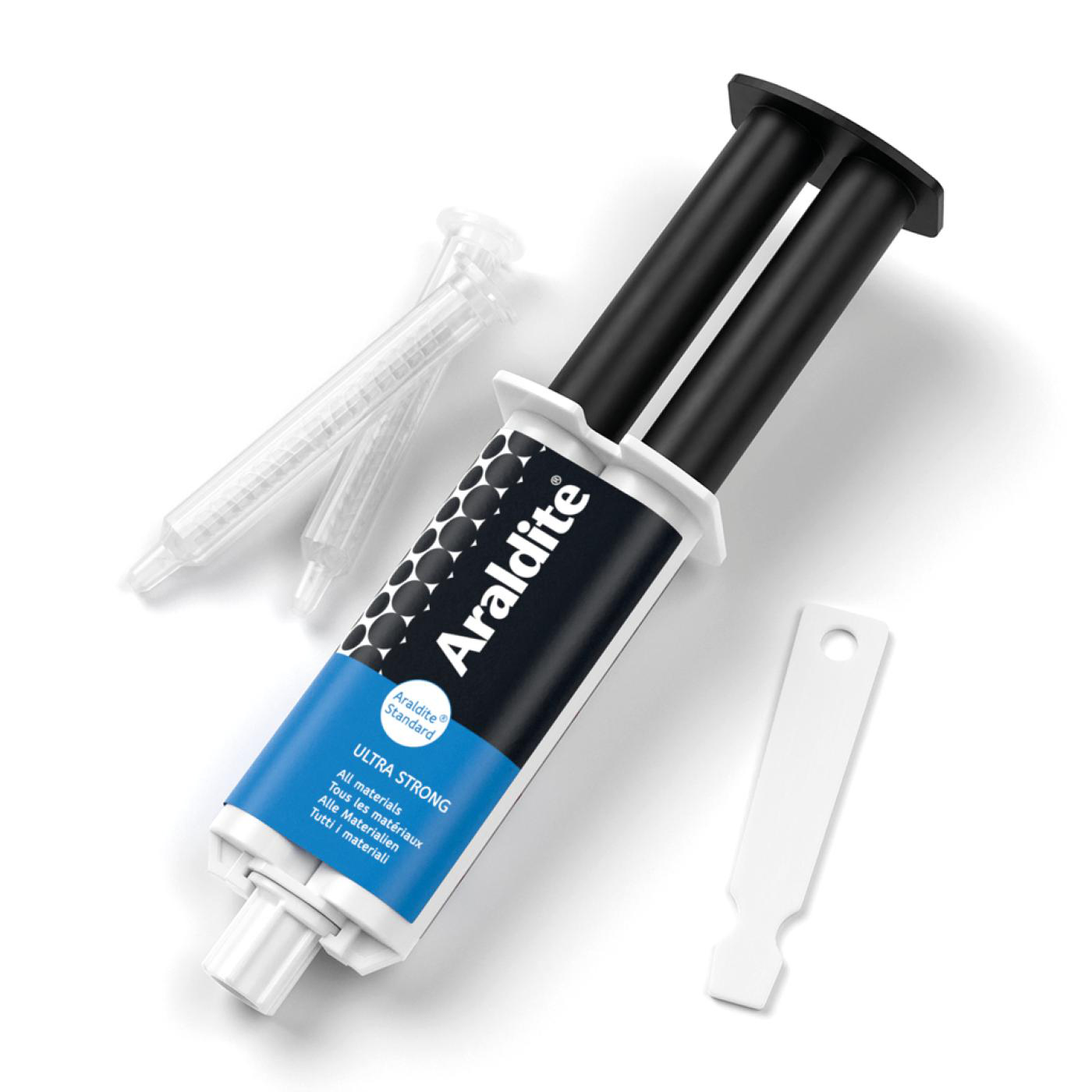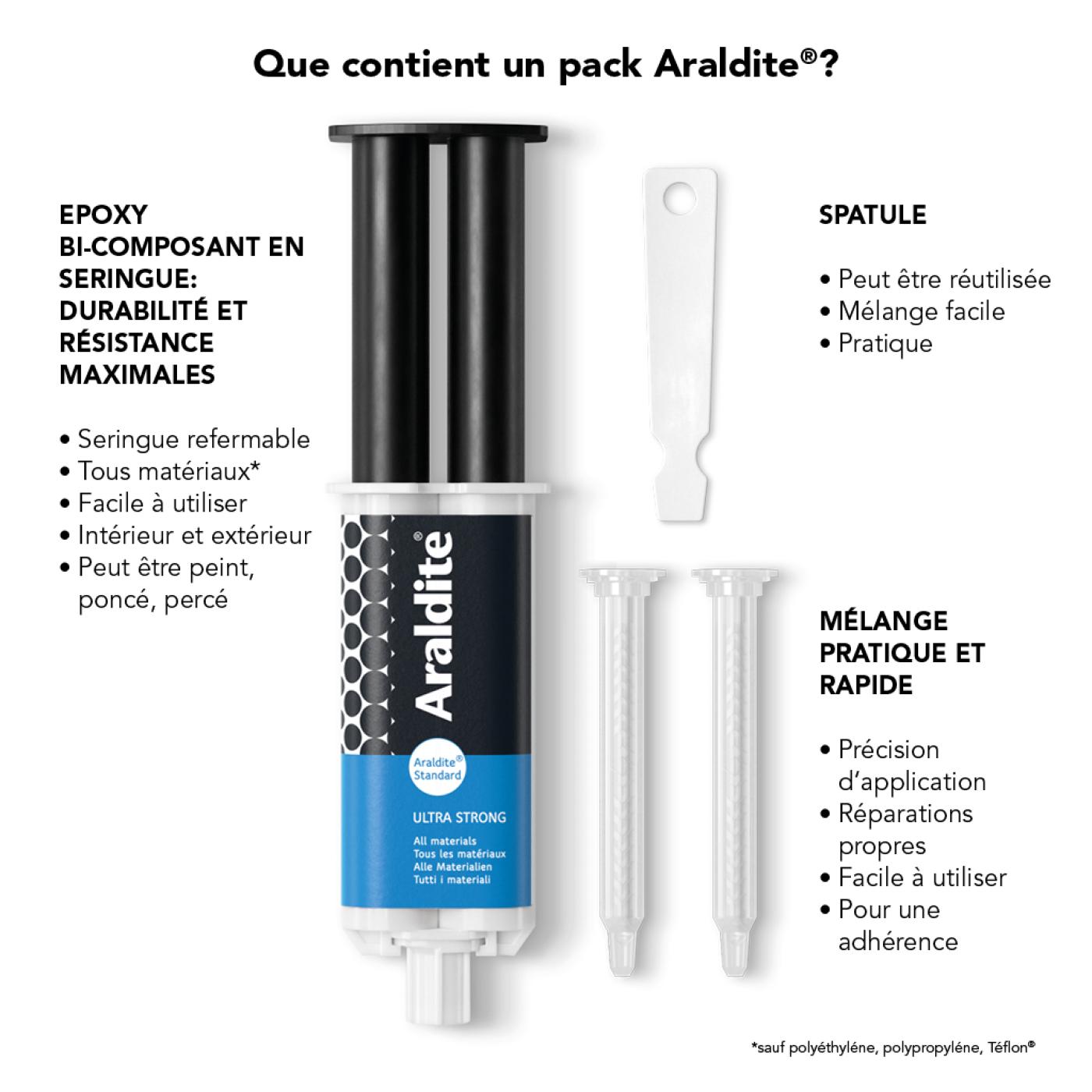 La colle Araldite® Standard est une colle époxy bi composant à prise progressive qui offre un collage très puissant et qui dure dans le temps. Adhère sur la porcelaine, la pierre, le marbre, la céramique, le bois, les métaux, le cuir et les plastiques (sauf polyéthylène, polypropylène et téflon).