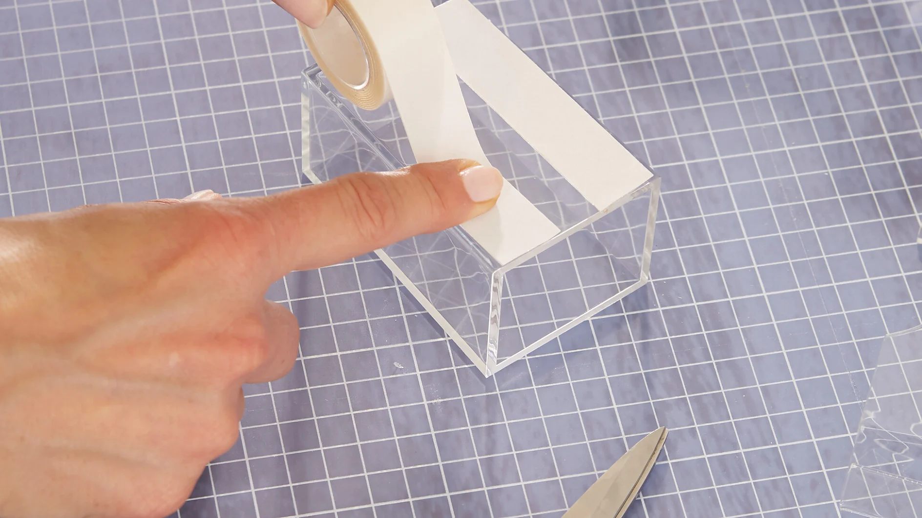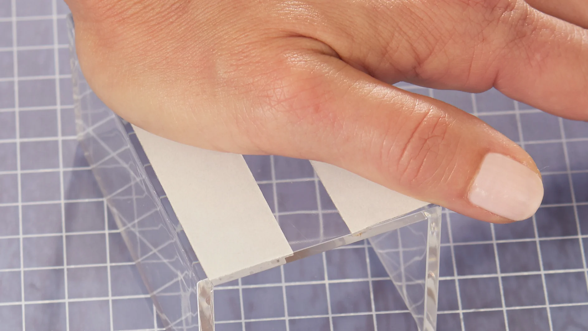 Appliquer le ruban adhésif de fixation à l’arrière de l’objet puis enlever les films de protection. Appuyer fermement pendant cinq secondes en prenant soin de ne pas toucher la surface adhésive.