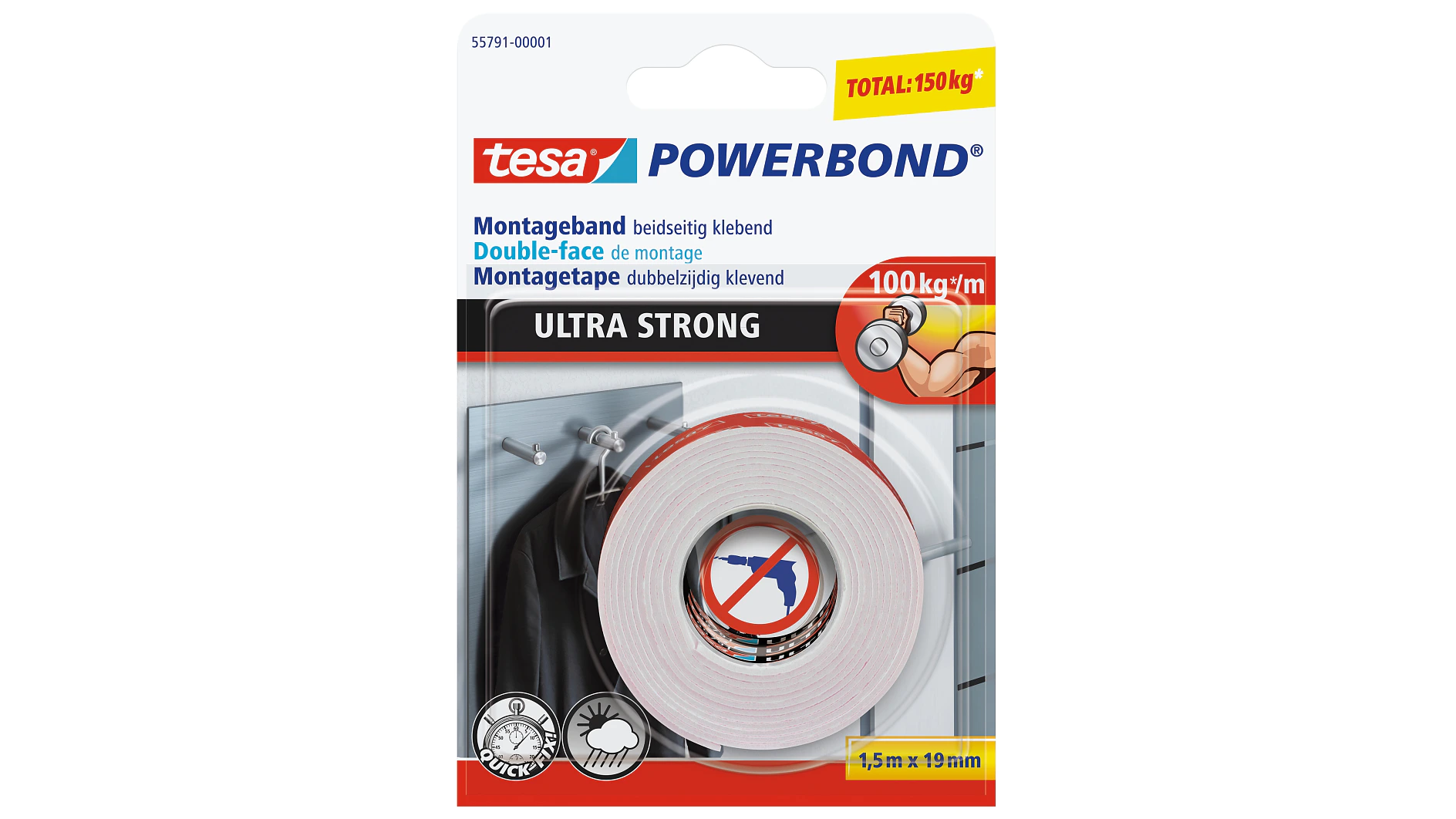 tesa Powerbond® Ultra Strong est le ruban de montage le plus puissant de tesa®. Il est adapté pour fixer des objets à l’intérieur et à l’extérieur. La performance adhésive impressionnante de jusqu’à 10 kg par 10 cm signifie que vous pouvez vous passer de perceuses, de chevilles et de vis même pour fixer des objets plus lourds. Le ruban de montage est facile à manipuler et offre une tenue permanente et fiable.