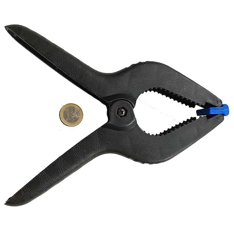 Pince de serrage pour maintenir en pression les pièces encollées. Ouverture 7 cm. Largeur patin 2,7 cm.