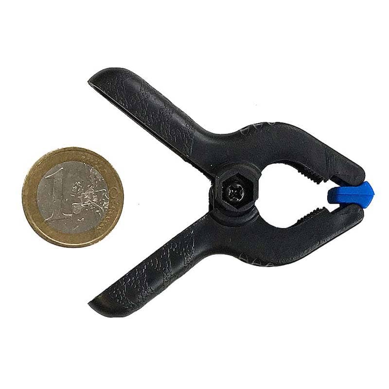 Pince de serrage pour maintenir en pression les petites pièces encollées. Ouverture 3 cm. Largeur patin 1 cm.